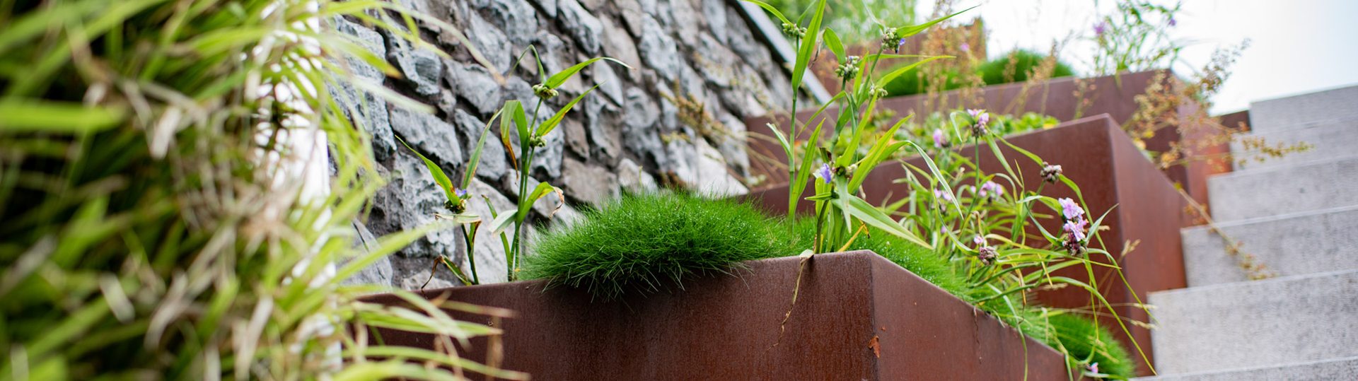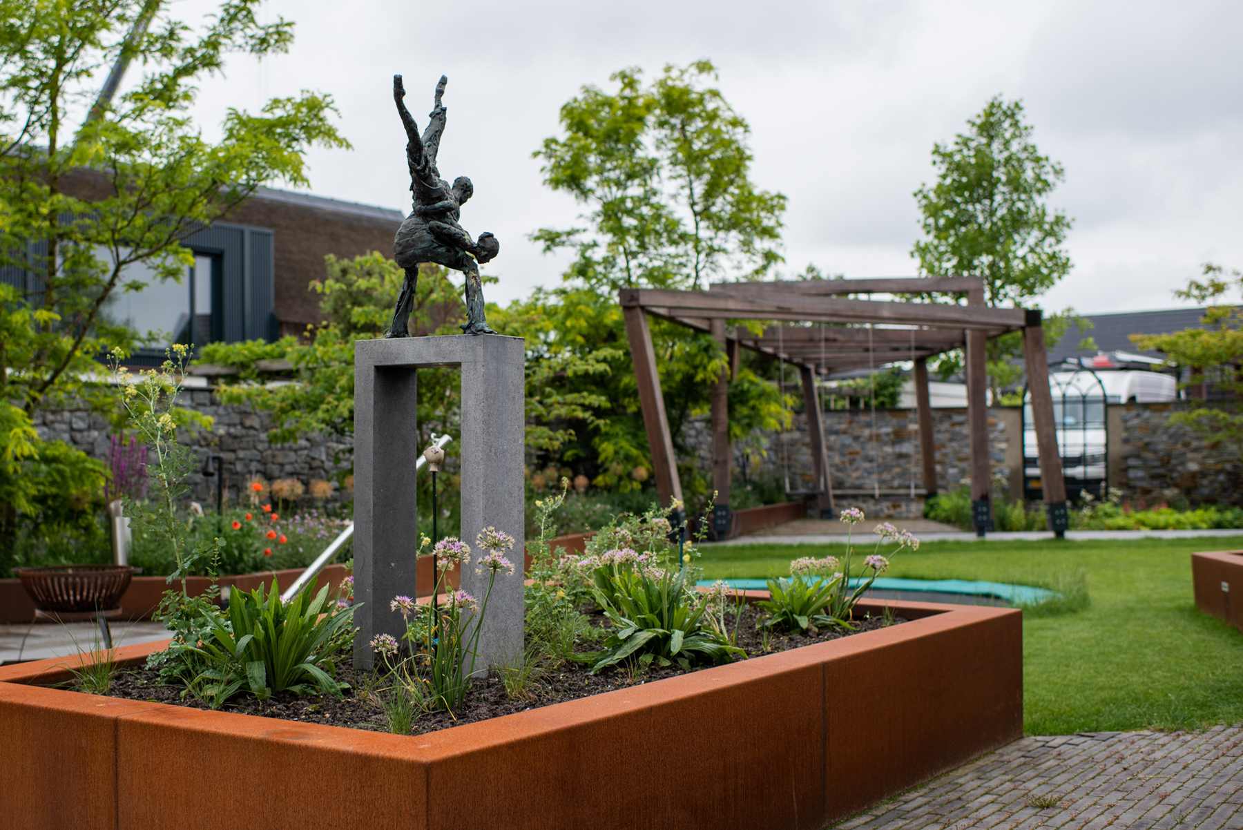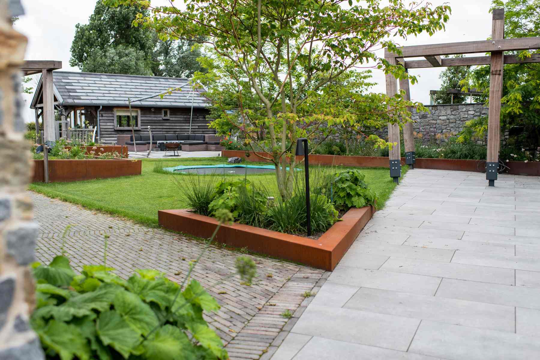 Naast de verhardingen en het gazon, plaatsten we ook de planten. Hiervan staat een deel in cortenstalen bakken. Ook dit heeft een robuuste, stoere uitstraling. De verschillende terrassen en gezellige hoekjes, maken dat je op veel verschillende plekken geniet van deze fantastische tuin.