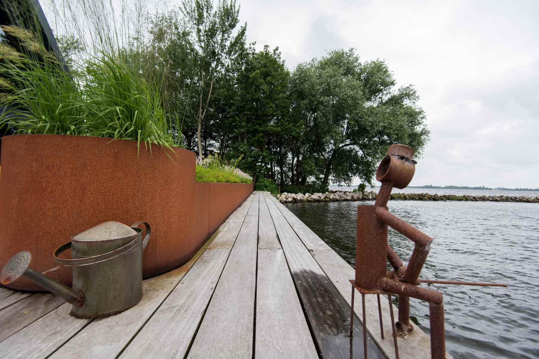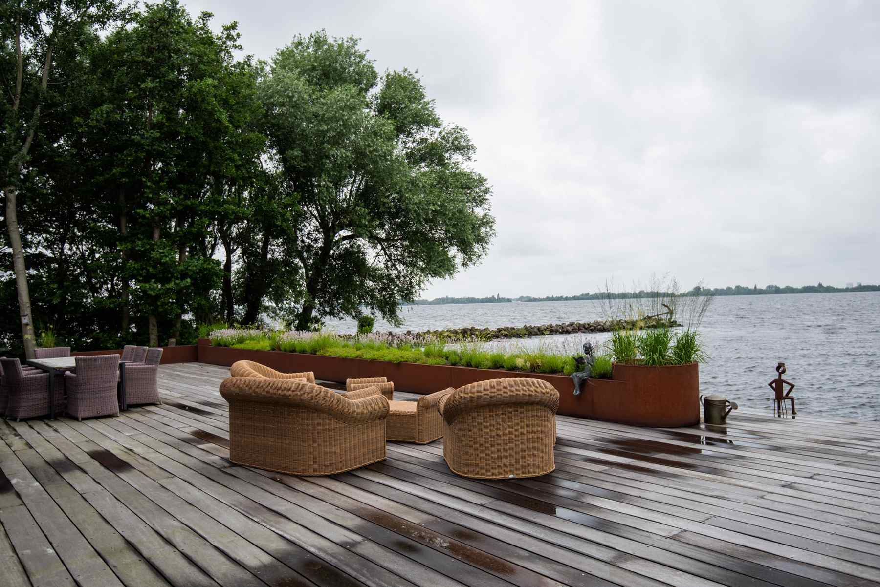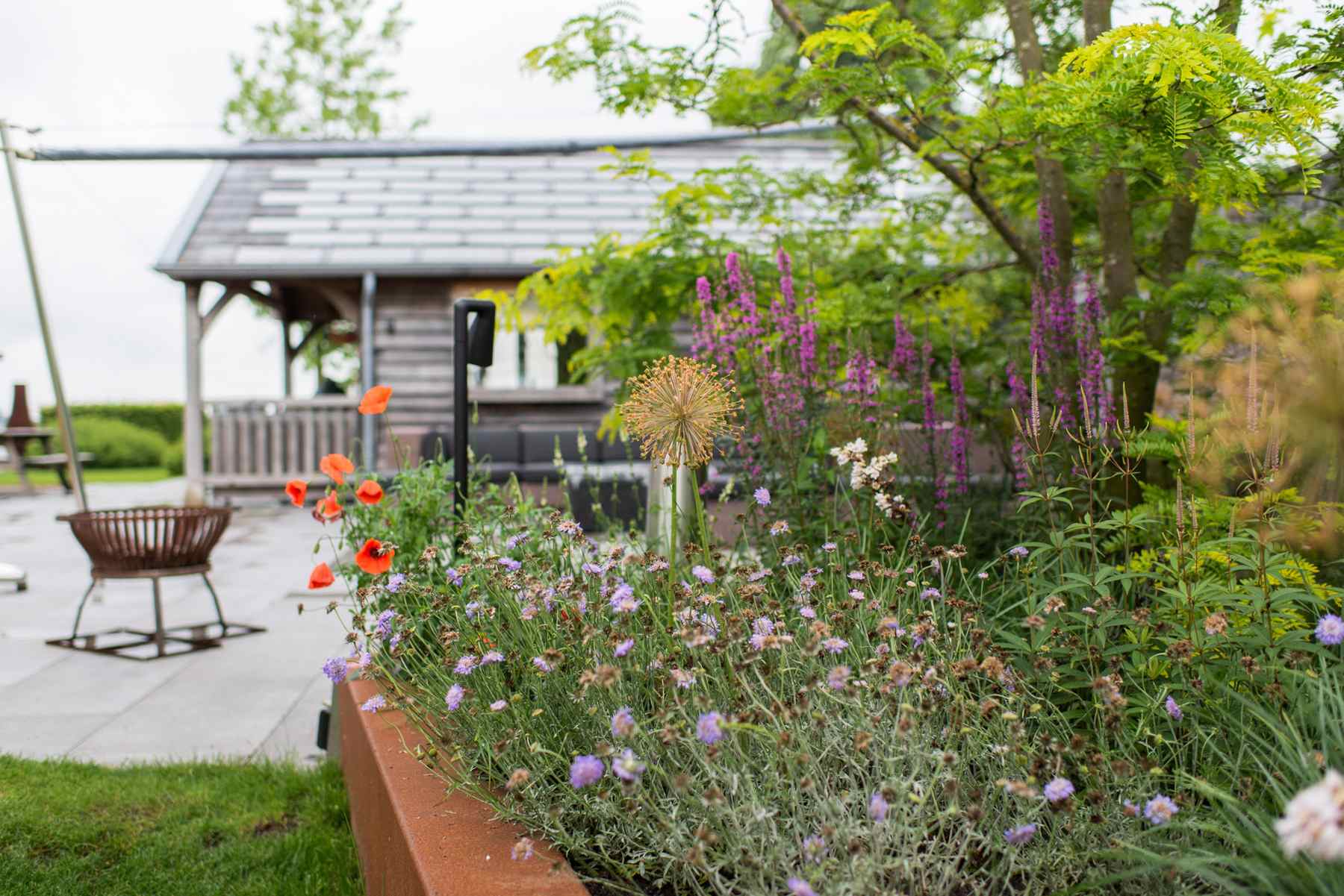 Naast de verhardingen en het gazon, plaatsten we ook de planten. Hiervan staat een deel in cortenstalen bakken. Ook dit heeft een robuuste, stoere uitstraling. De verschillende terrassen en gezellige hoekjes, maken dat je op veel verschillende plekken geniet van deze fantastische tuin.