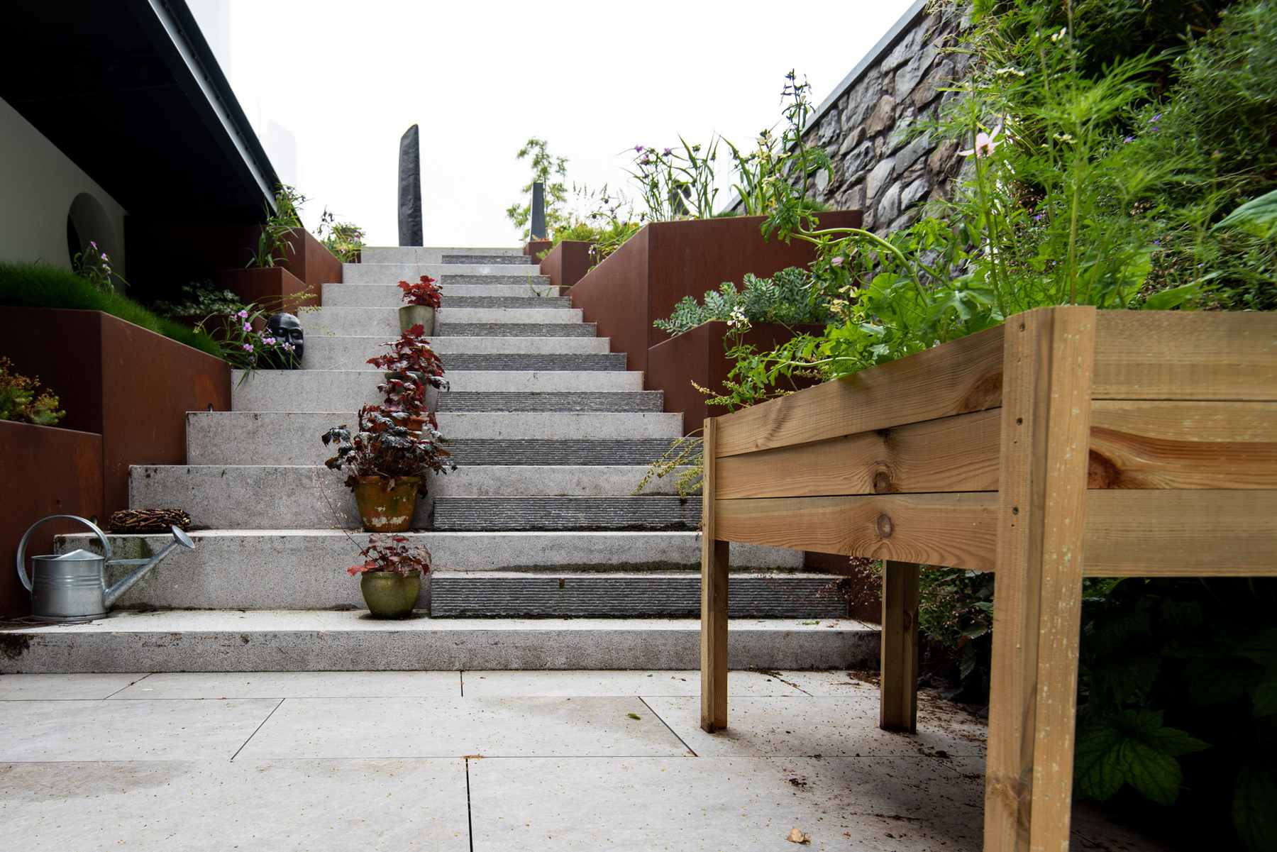 De trap achter het tuinhuis is gemetseld. Dit geeft een stoere uitstraling. In de gehele tuin brachten we riolering aan ten behoeve van de afwatering. Het regenwater loopt via de rvs-lijnroosters naar het riool. Onder de grond bevindt zich ook een drainage systeem. Ook plaatsten we een irrigatiesysteem zodat het gazon en de planten op de juiste momenten automatisch bewaterd worden.