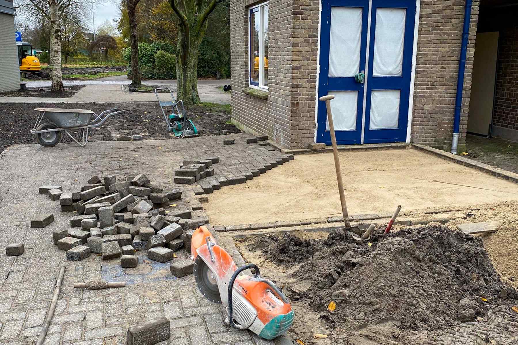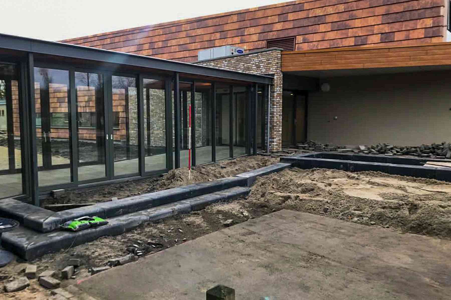 Zoals bij veel andere projecten moest er eerst worden geruimd! Na het afvoeren en opruimen van de oude verhardingen konden we starten met het grondwerk. Dit bestond uit het voorbereiden van de plantvakken, grasvakken en het beplantingsvak voor de haag. Daarnaast trilden we een zandlaag van meer dan 1.300m2 af voor het later aan te brengen straatwerk.