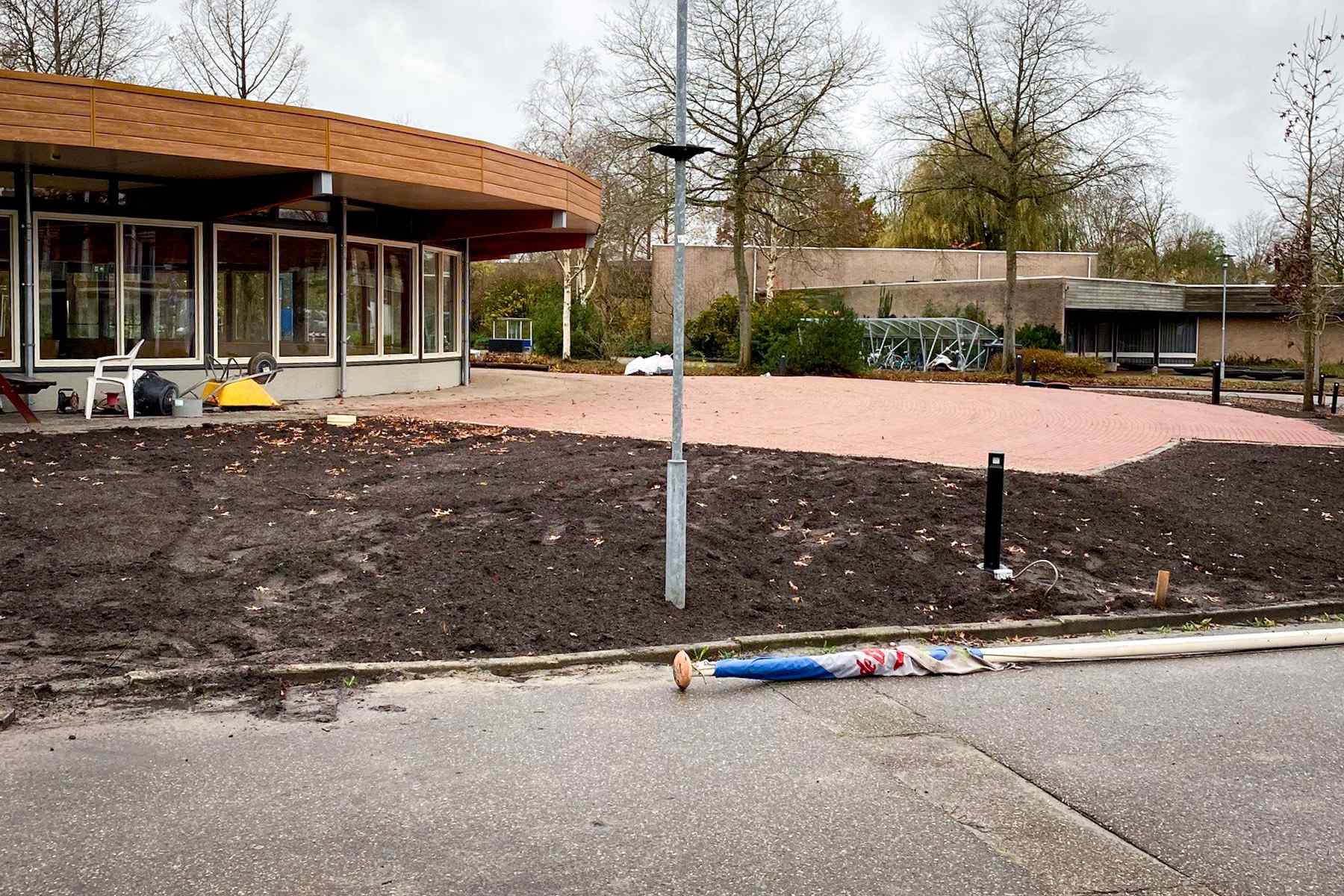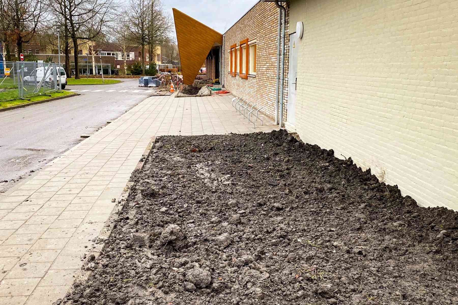 De volgende stap was het aanbrengen van cunetzand voor de bestrating en het aanbrengen van teelaarde voor het gazon en de plantvakken. De plantvakken werden gefreesd en ontdaan van puin en vuil. Ondertussen werd er meubilair voor het terrein geleverd, verplaatst en aangebracht. Voorbeelden hiervan zijn de fietsparkeerbeugel, vlaggenmast en tuin- en straatverlichting. Toen alles op de juiste plek stond konden we riolering en drainage aanbrengen.