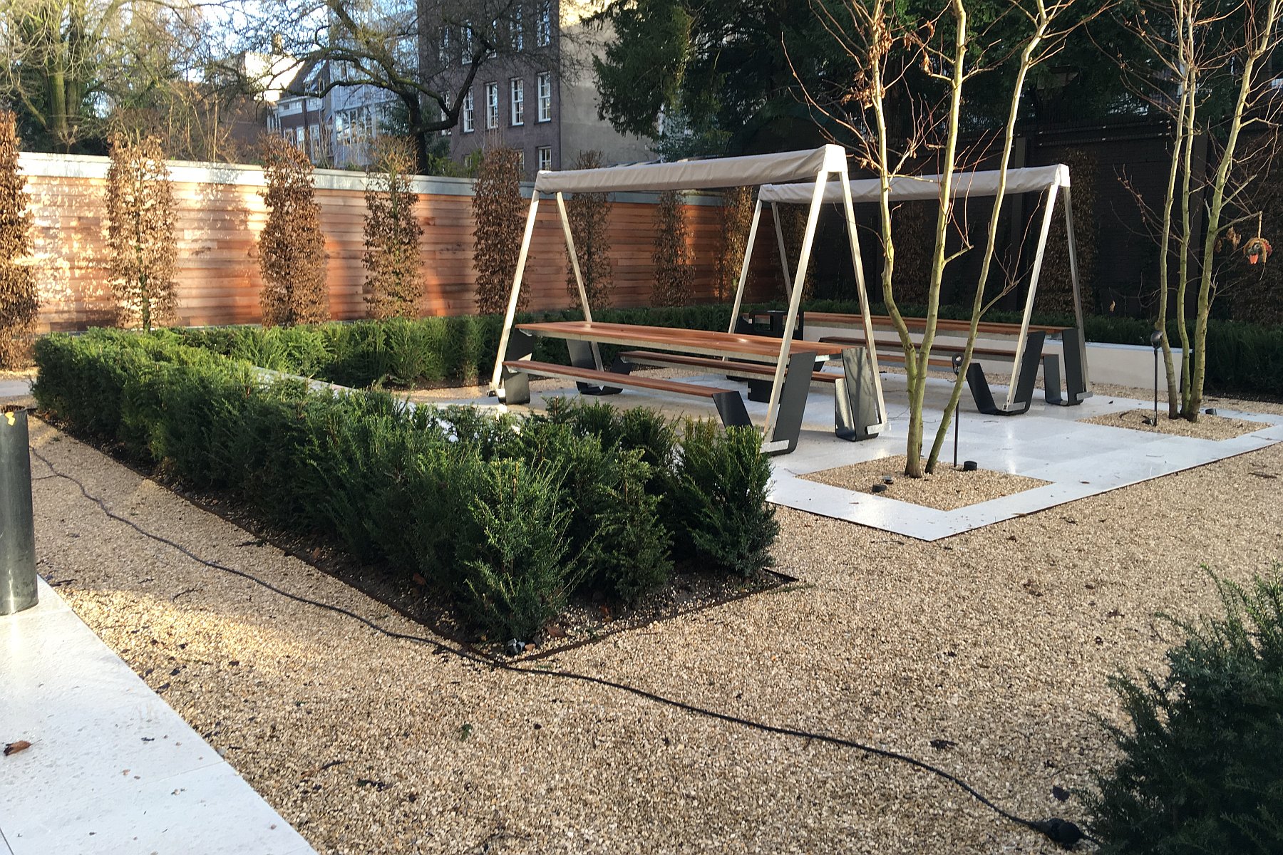 - Werkzaamheden: Verharding (tegels en grind) plaatsen, banken maken van tegels, beplanting, muren verven, rvs-spandraden aanbrengen, irrigatiesysteem aanleggen, verlichting, tuinmeubilair plaatsen, aan- en afvoeren materiaal.