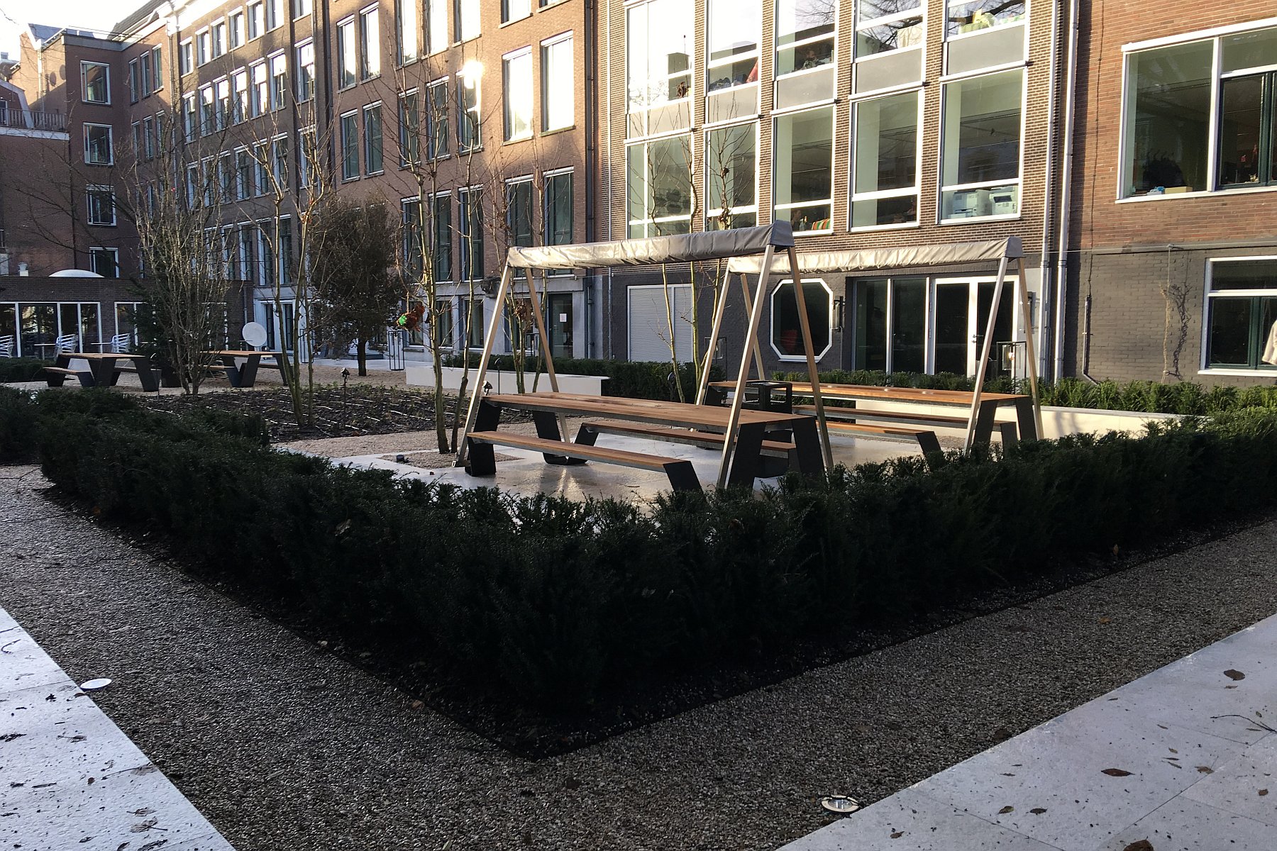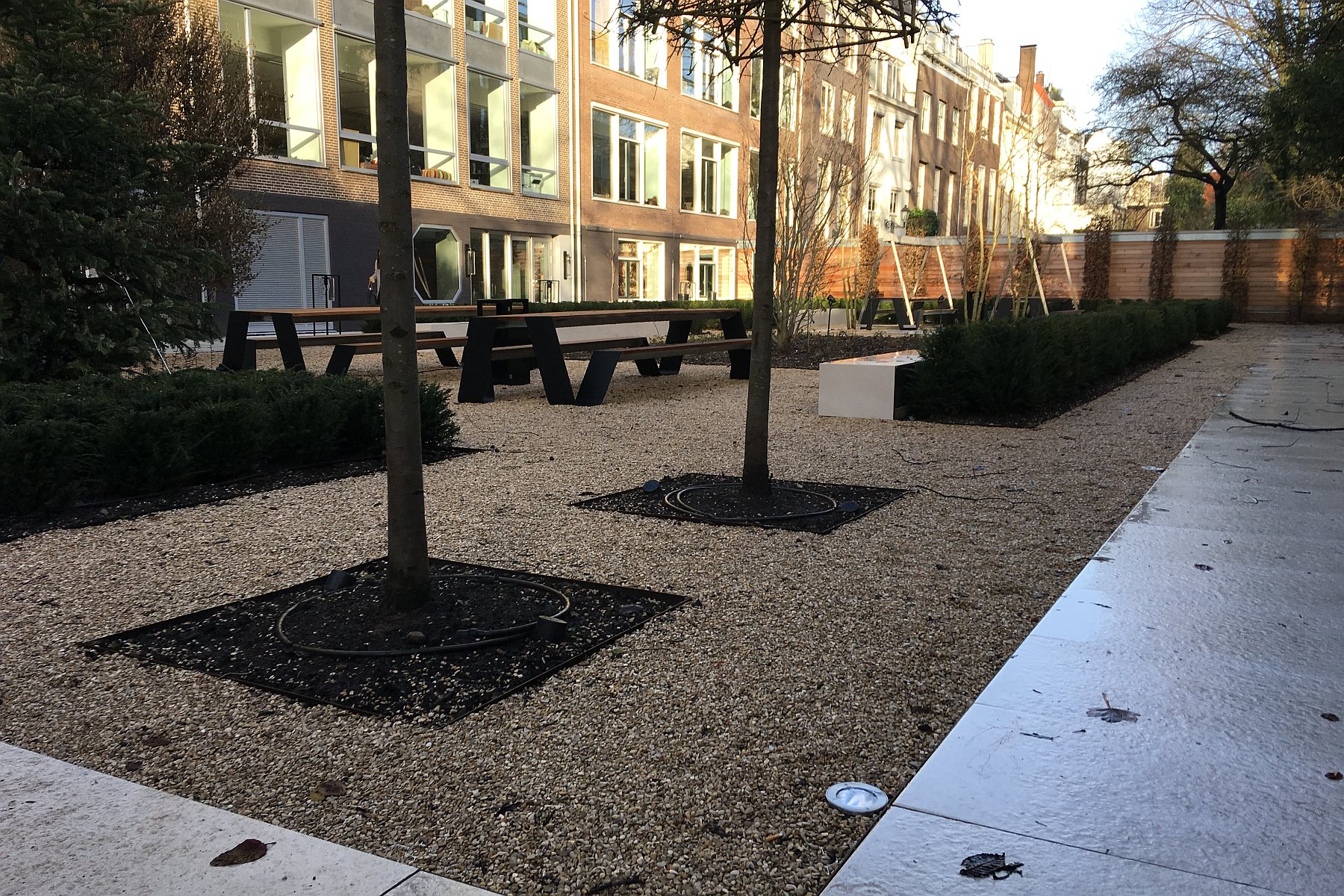 Aan de Keizergracht in Amsterdam heeft M. van der Spek Groenprojecten in combinatie met Copijn Tuin- en Landschapsarchitecten de aanleg van een strakke moderne binnentuin gerealiseerd. De bedrijfstuin heeft een oppervlak van 850 m2. Als verharding is gekozen voor keramische tegels (330 m2) en Castle grind (260 m2). Van diezelfde keramische tegels zijn maatwerk banken gemaakt. De rest is beplant met voorgevormde carpinuszuilen, klimplanten, taxusblokken, vaste planten en bloembollen. Verder zijn onder andere de muren geverfd, rvs-spandraden aangebracht en is er een irrigatiesysteem aangelegd. Tot slot is de verlichting aangebracht en tuinmeubilair geplaatst. Omdat deze tuin in hartje Amsterdam ligt, was het een uitdaging om al het materiaal via de smalle straten op de juiste plek te krijgen. Ook dat is met succes gelukt.