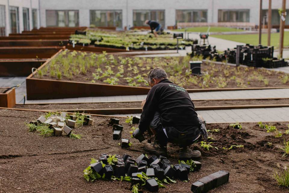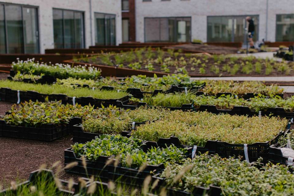 De daktuin van in totaal 2.300 m² is met zorg ingericht en combineert verschillende materialen en beplanting tot een uitnodigende buitenruimte.