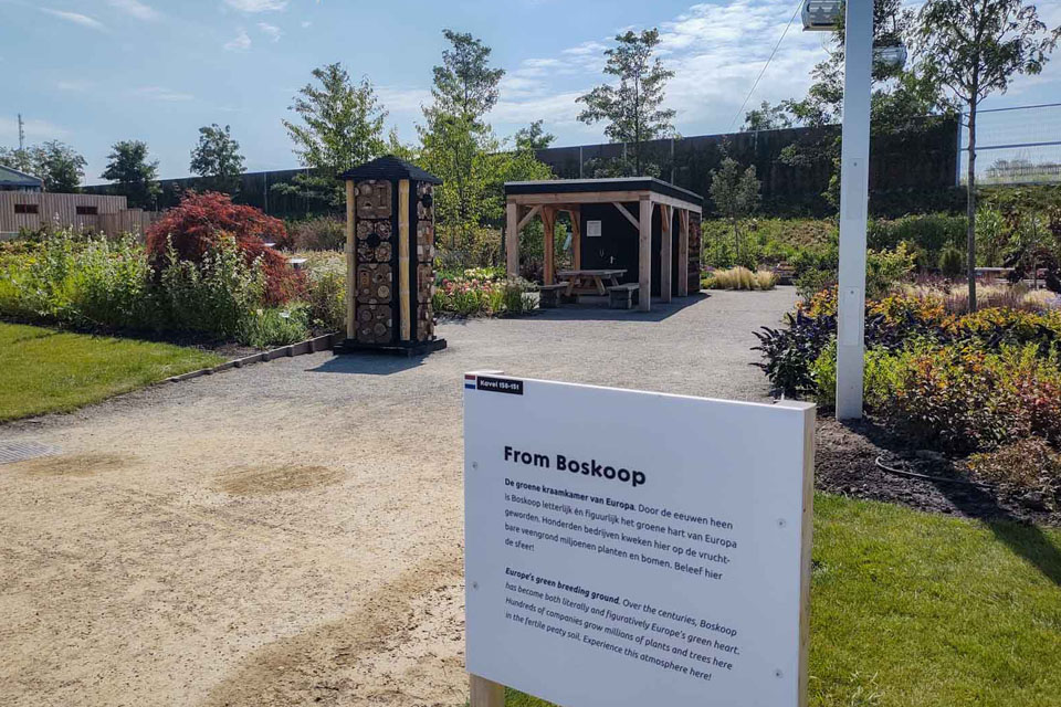Onder de noemer ‘From Boskoop’ nemen de boomkwekers uit de Greenport Boskoop deel aan de Floriade Expo. De inspiratie voor het ontwerp is gevonden in het Boskoops landschap met smalle kavels, brede sloten en een intensief groen patchwork. Zie en lees hier meer over het ontwerp.