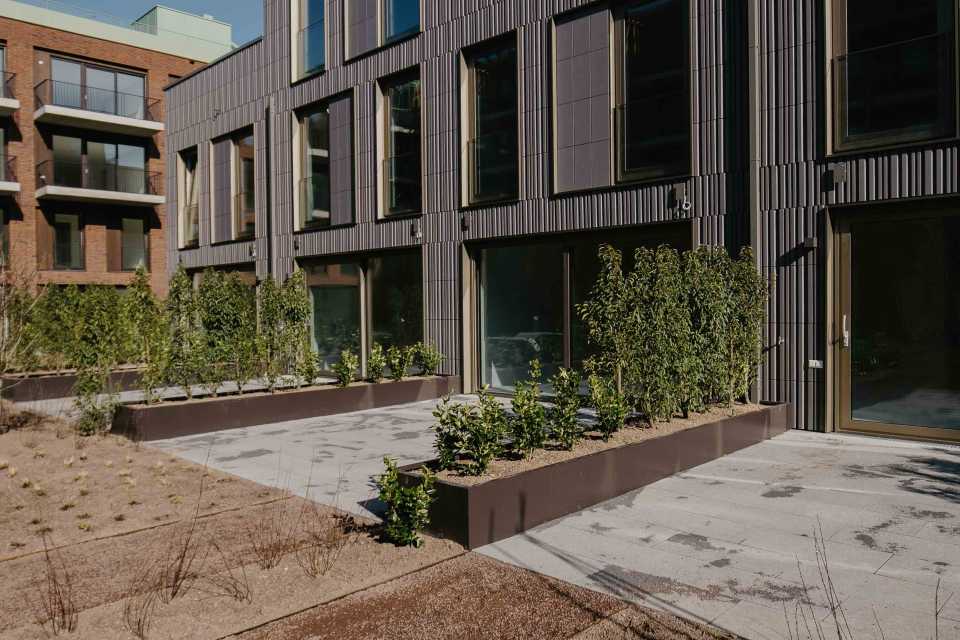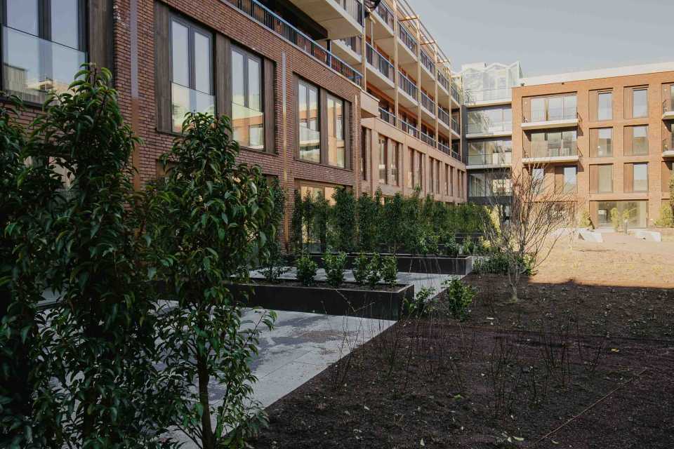 Daarnaast zijn meerdere balkons voorzien van plantenbakken met beplanting, waardoor het groene karakter van het project op alle niveaus zichtbaar is.