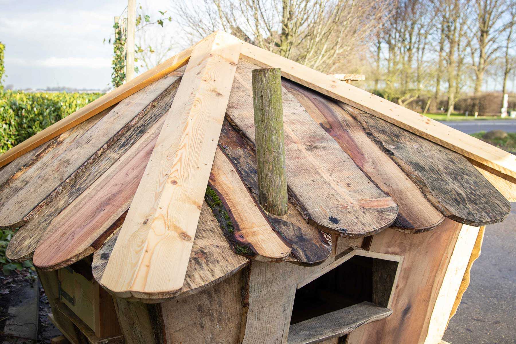 Van het resthout wat terugkomt van onze boomverzorgers wat we niet gebruiken voor insectenhotels, maken ze in onze timmerwerkplaats handgemaakte huisjes. Deze huisjes maakte collega Dave omdat er veel resthout aanwezig was maar we maken ook huisjes op maat.