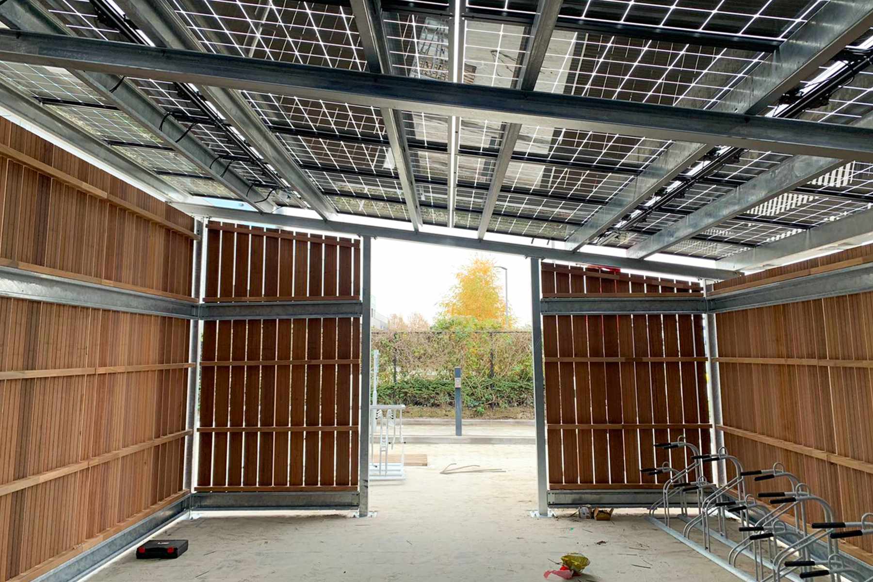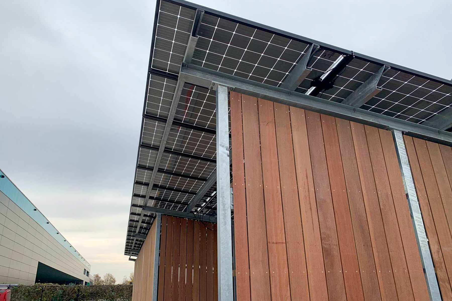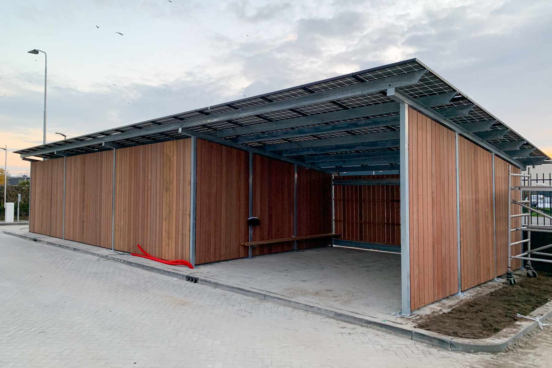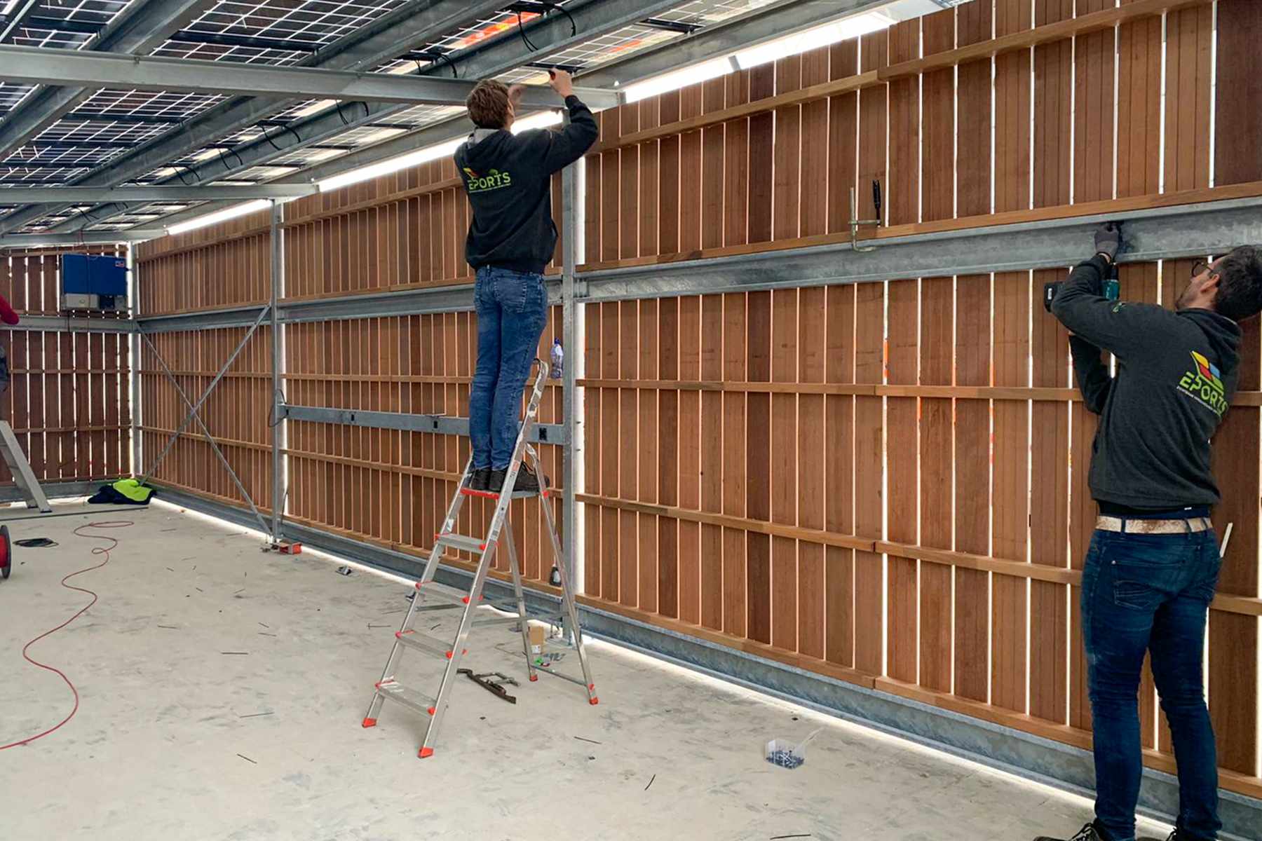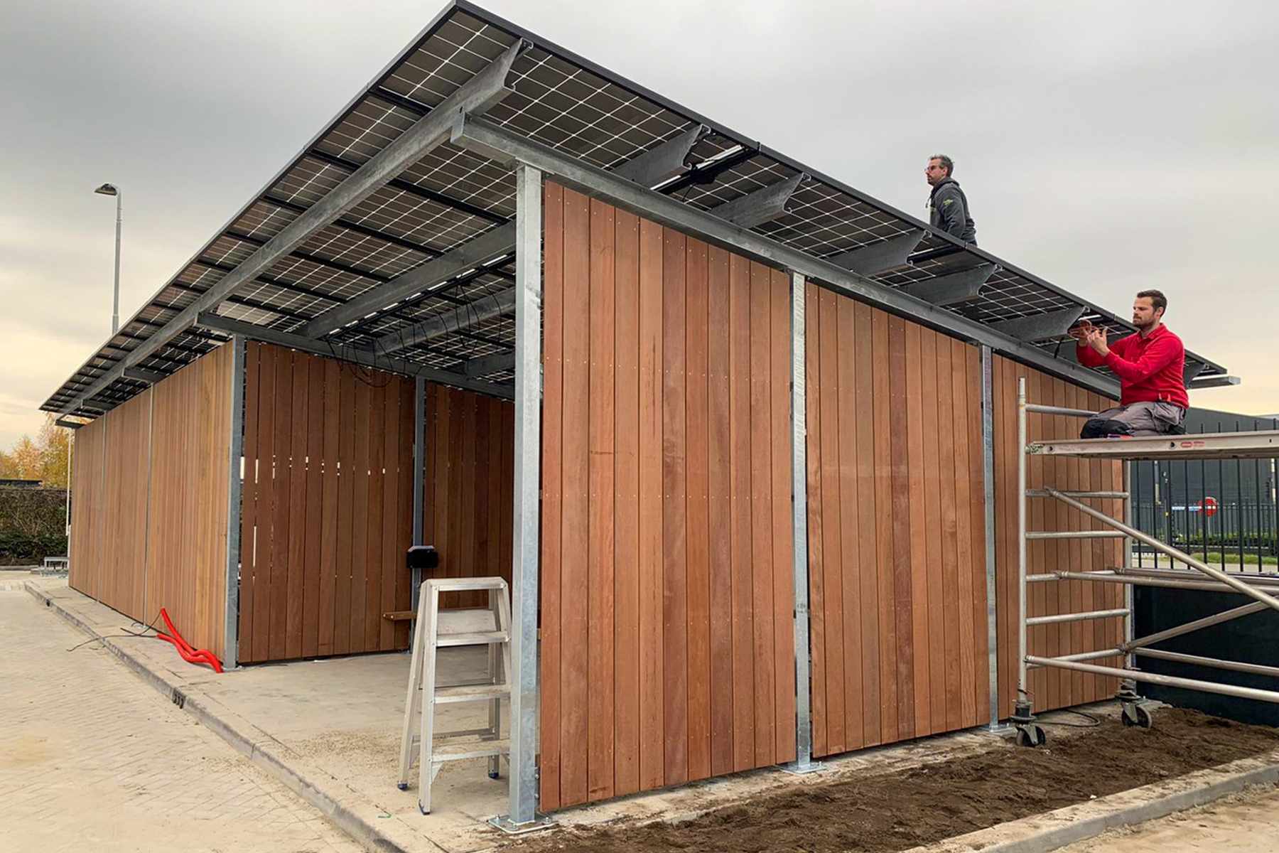 Voor deze opdracht hebben wij FSC-gecertificeerd Keruing hout van 15x145 mm gebruikt. Keruing hout gaat lang mee en ziet er mooi uit. De bekleding is in onze timmerwerkplaats geprefabriceerd en daarna vervoerd naar Eindhoven. Doordat de bekleding in handzame panelen is gemaakt kon E-ports deze snel en vakkundig bevestigen aan het metalen frame van de fietsenstalling. Op het dak van de fietsenstalling plaatste E-ports 76 zonnepanelen. Tot wel 48 fietsers kunnen hun elektrische fiets opladen in de fietsenstalling.