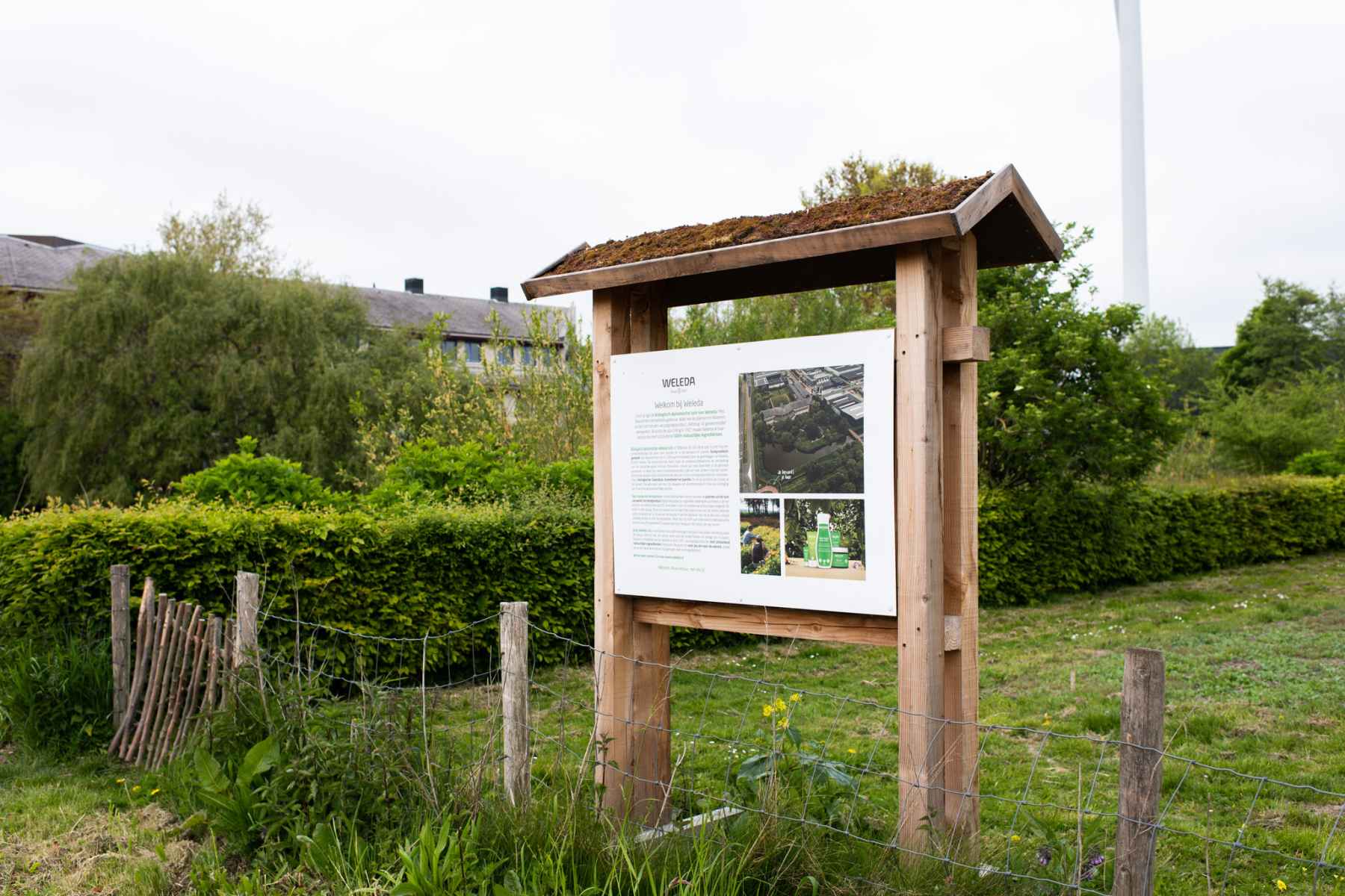 Voor het jubileum van Weleda maakten wij dit groene insectenhotel wat dient als informatiebord. Het hotel is helemaal naar wens aangepast, van sedumdak tot informatiebord.