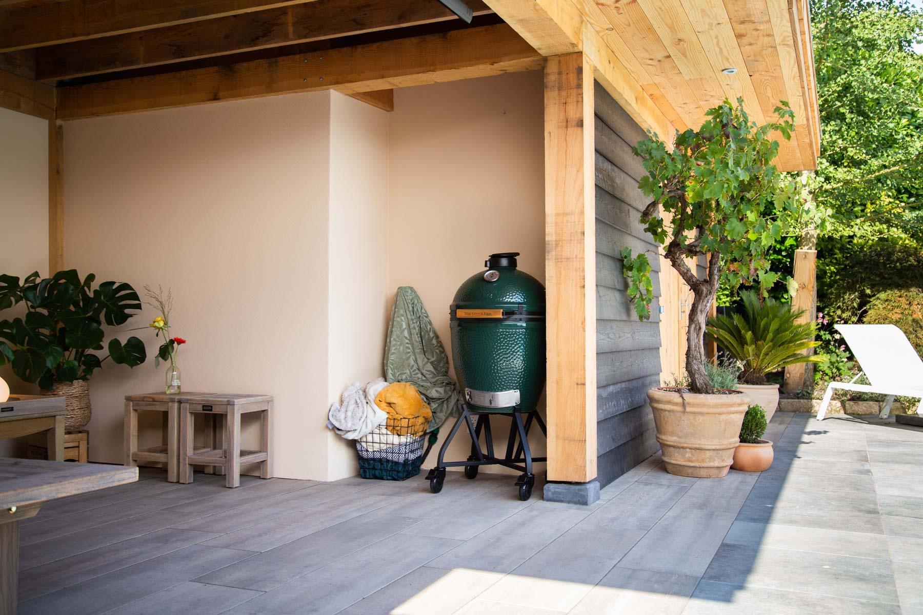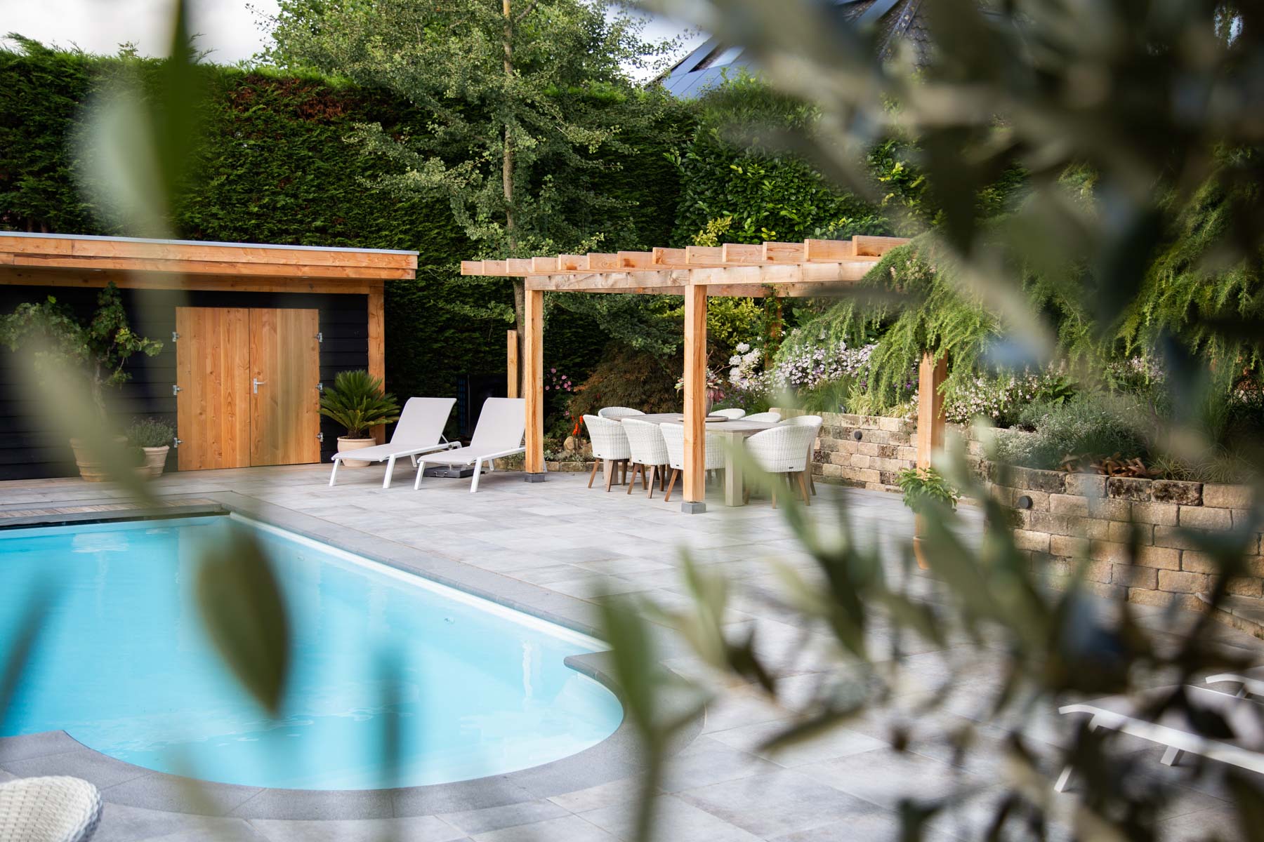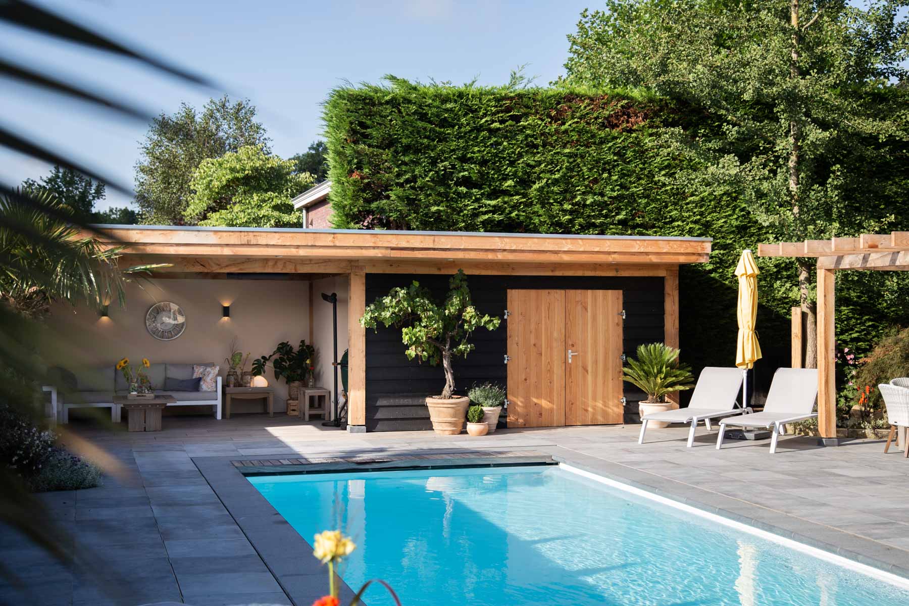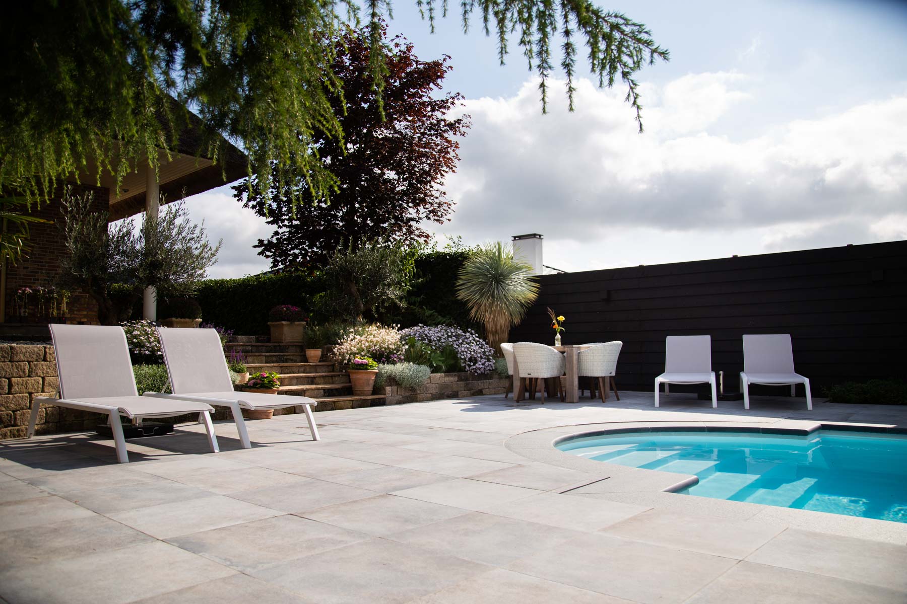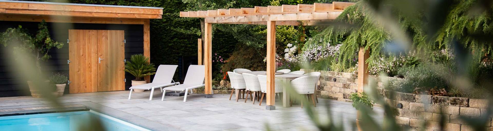 Wanneer je de tuin binnenstapt, loop je eerst over het bestaande terras in mediterrane tinten. Via de natuurstenen trap kom je bij het zwembad. Hier liggen mooie keramische tegels die aansluiten bij het bestaande terras. Bij het zwembad is een grote pergola van Douglas hout gemaakt waar je heerlijk vertoeft met vrienden en familie. De pergola is niet alleen heel gezellig, maar dient ook als zonnescherm voor het terras. Daarnaast maakten wij een luxe overkapping in hout- en zwarttinten. Deze overkapping wordt gebruikt als buitenleefruimte en heeft ook een technische ruimte voor alle zwembad techniek. De zwarte schutting van Douglashout sluit mooi aan bij de overkapping en zorgt zo voor rust en eenheid in het geheel.