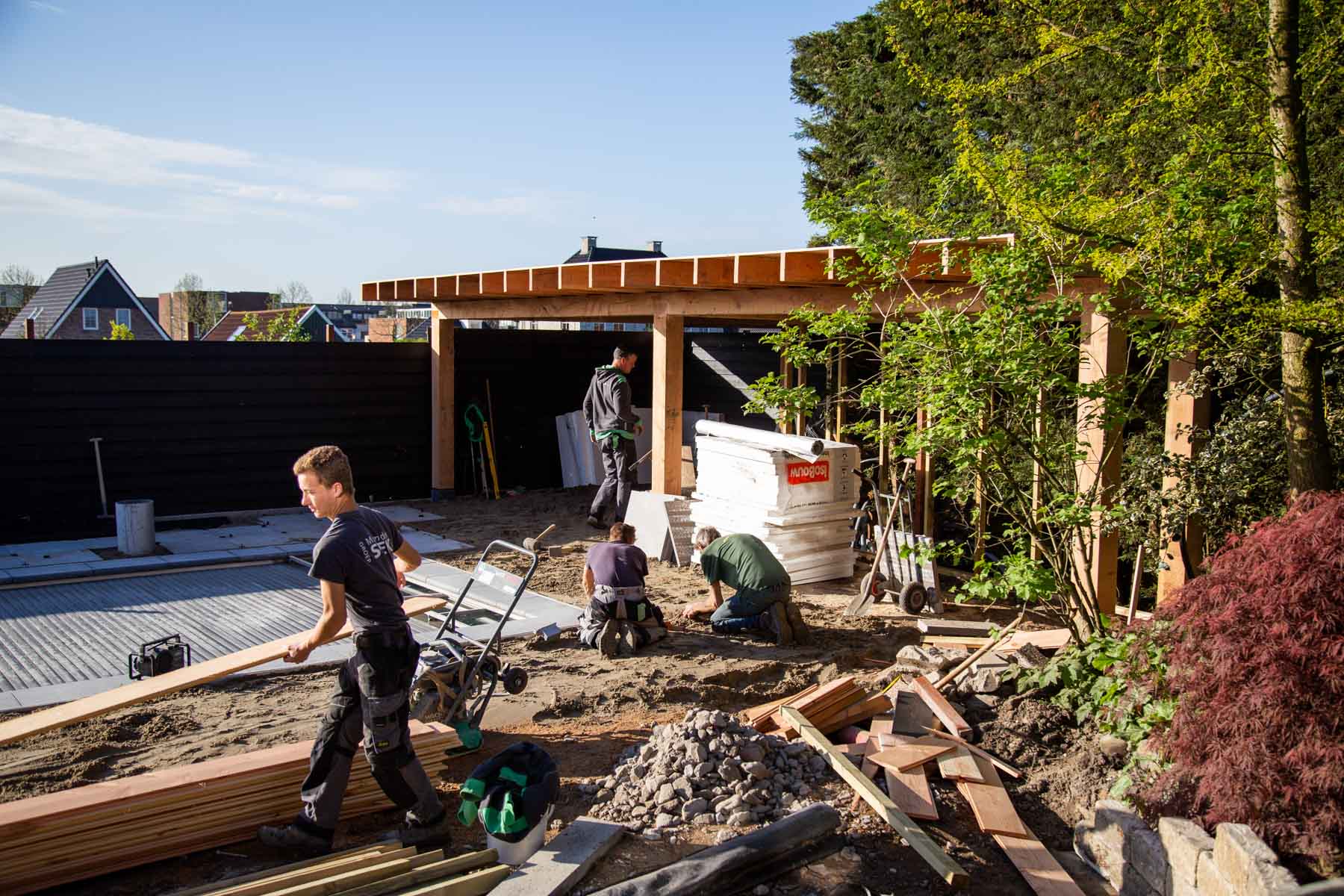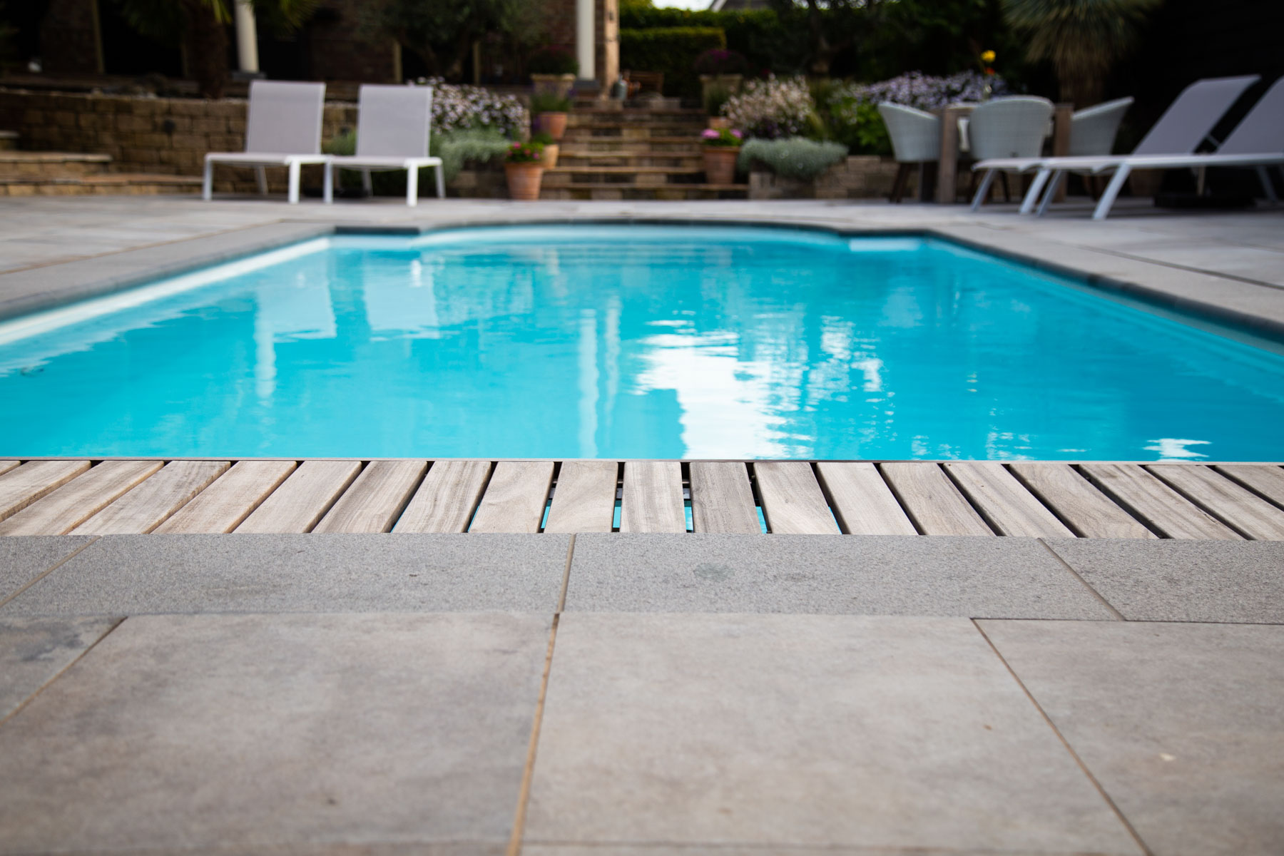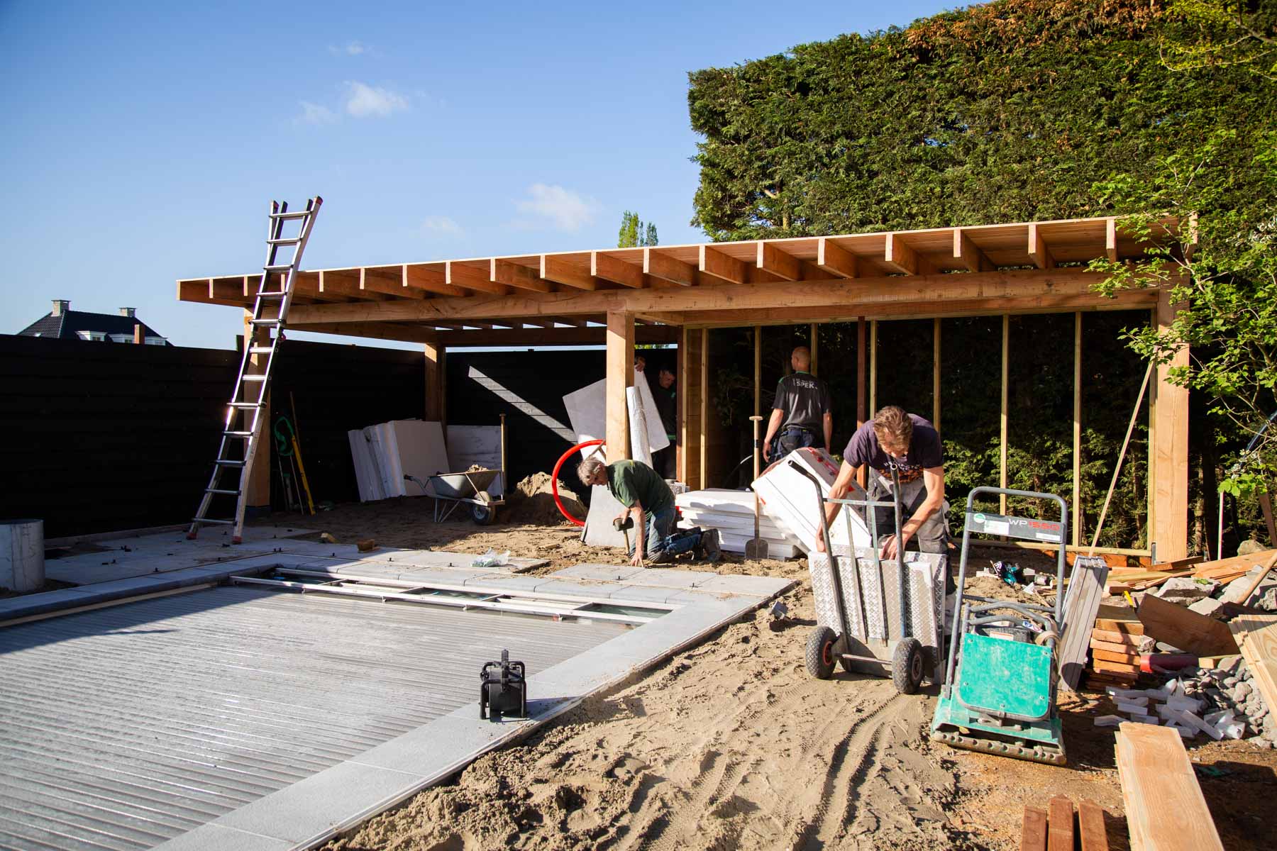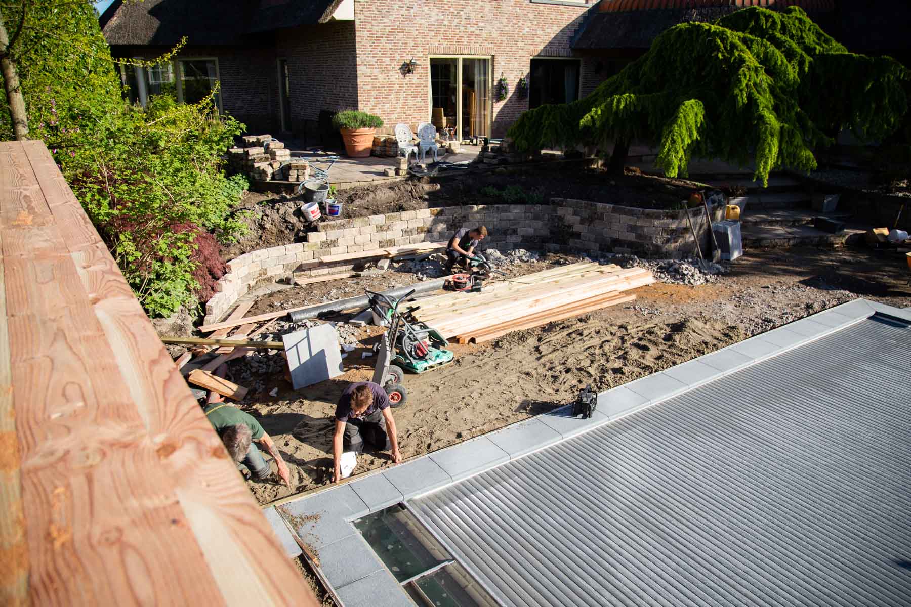 Wanneer je deze tuin binnenstapt, waan je je op een prachtige plek wat het hele jaar door aanvoelt als een luxe resort. In het voorjaar van 2021 zijn we begonnen met de renovatie en aanleg van deze omvangrijke tuin. We begonnen met het plaatsen van betonnen keerwanden en het grondwerk voor het nieuw aan te leggen zwembad. Na het leggen van het fundament, startten onze hoveniers met het houtwerk en de bestrating. Stukje bij beetje veranderde de tuin in een hele nieuwe, luxe omgeving.