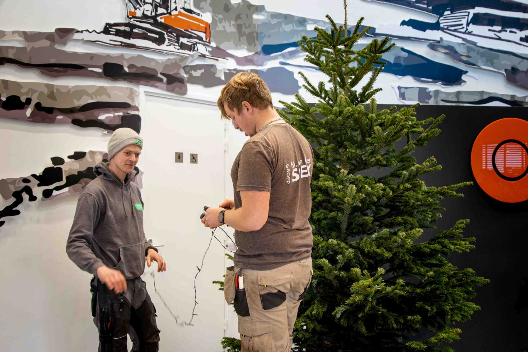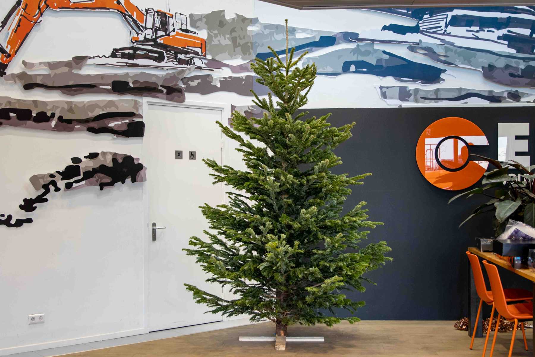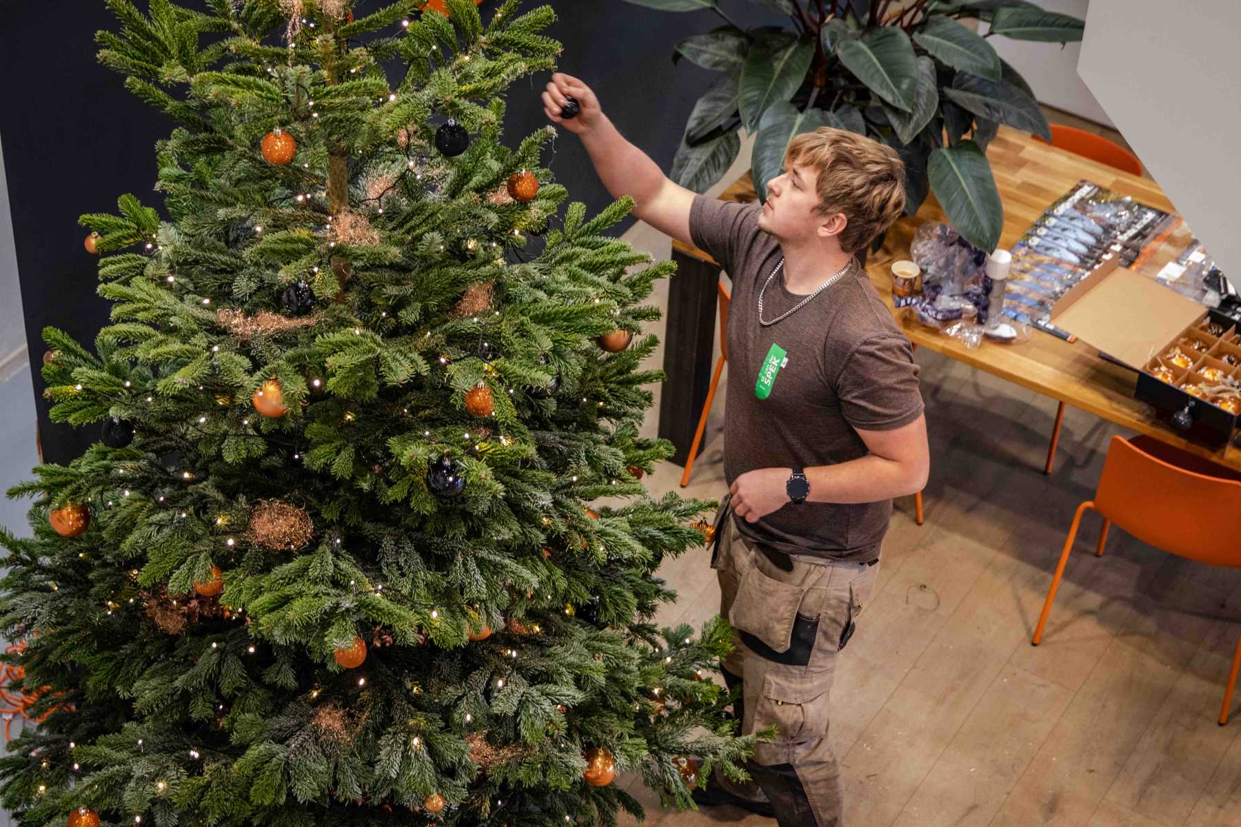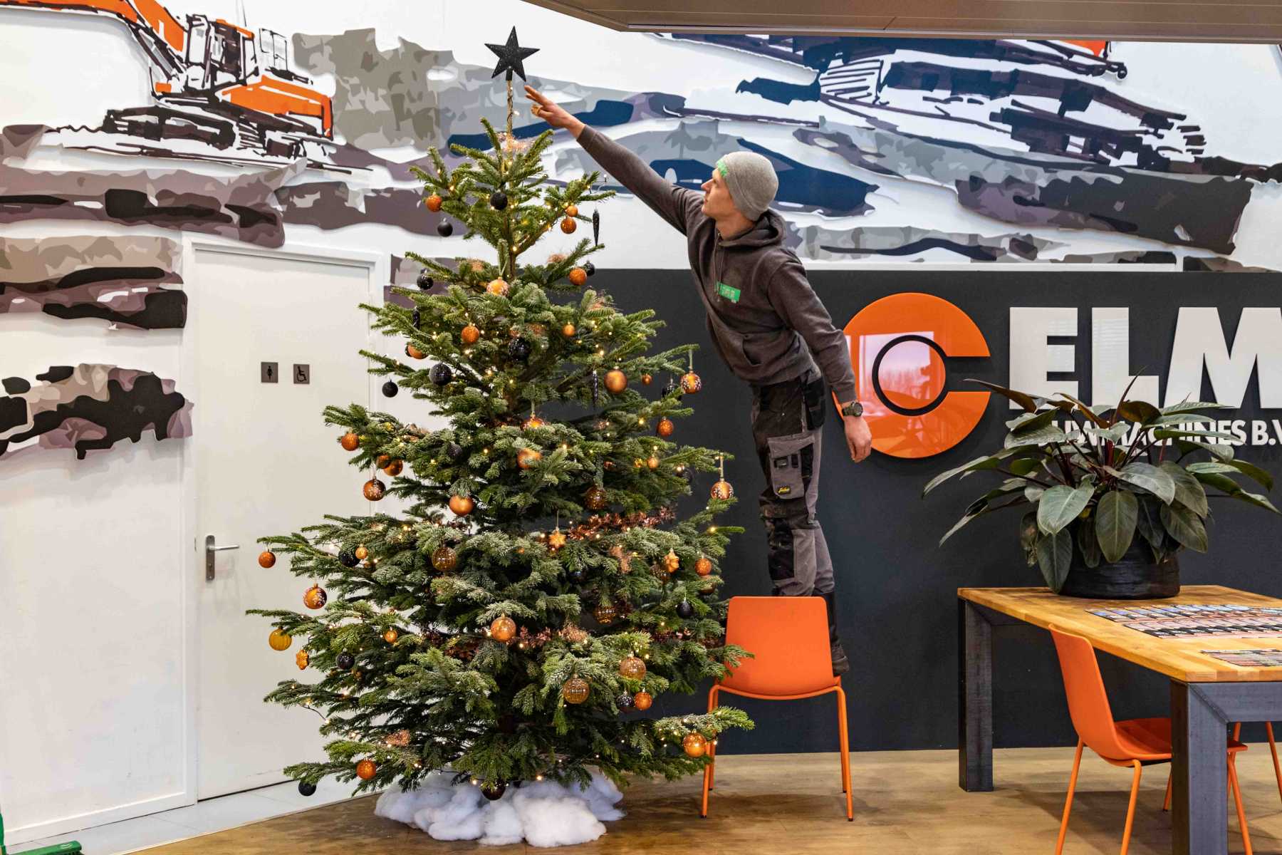 De huisstijlkleuren van ELM zijn oranje en antraciet; precies de kleuren die terugkomen in de versiering van deze echte Nordmann kerstboom.