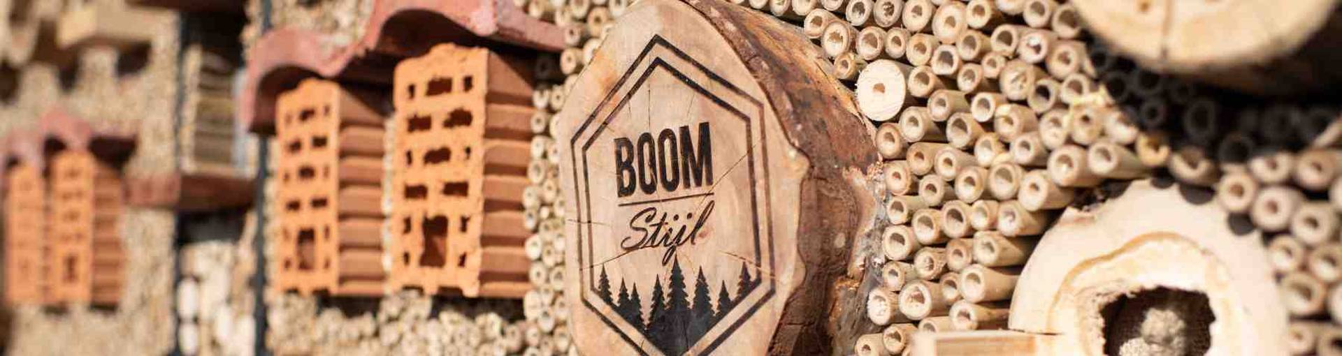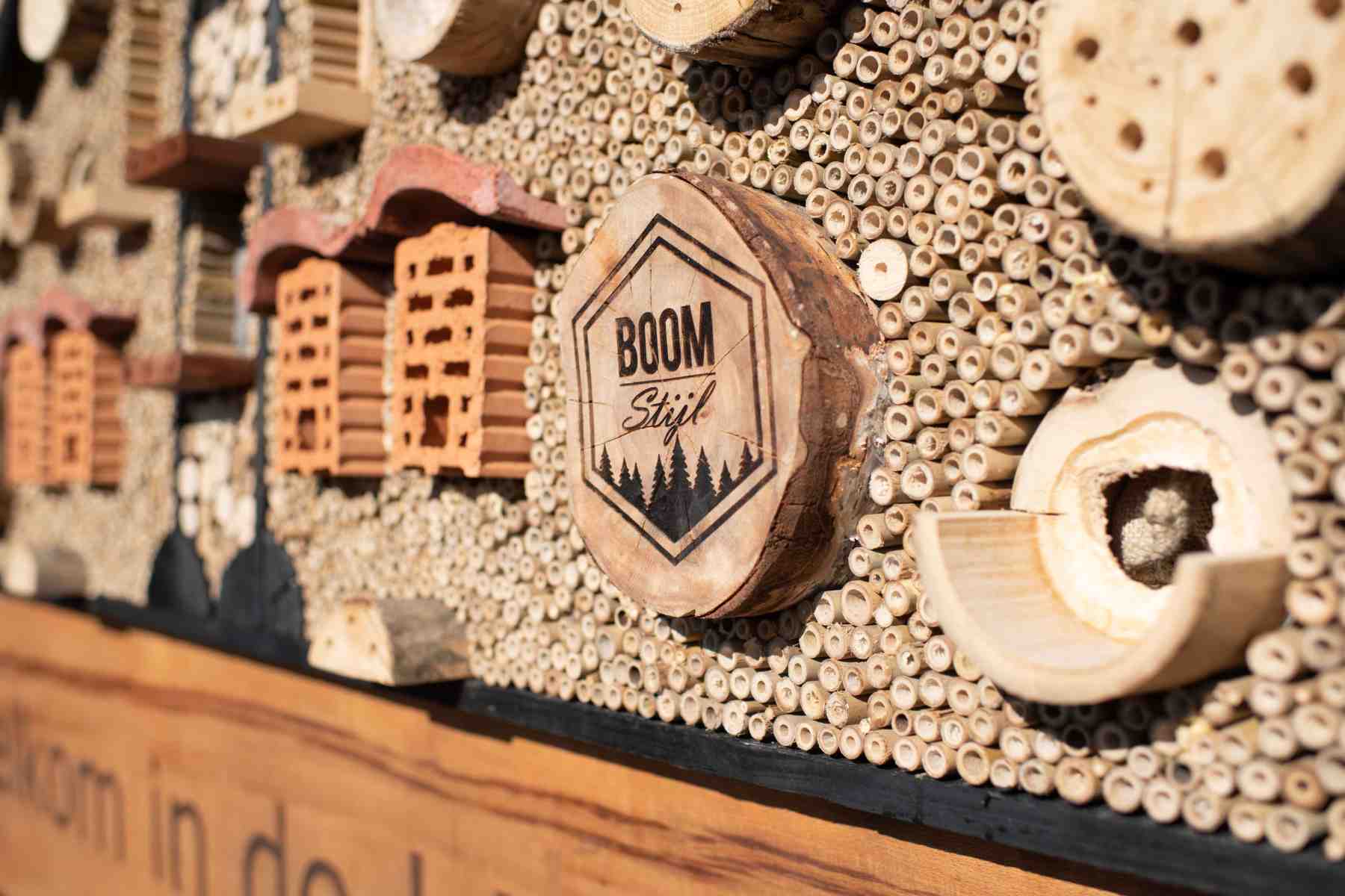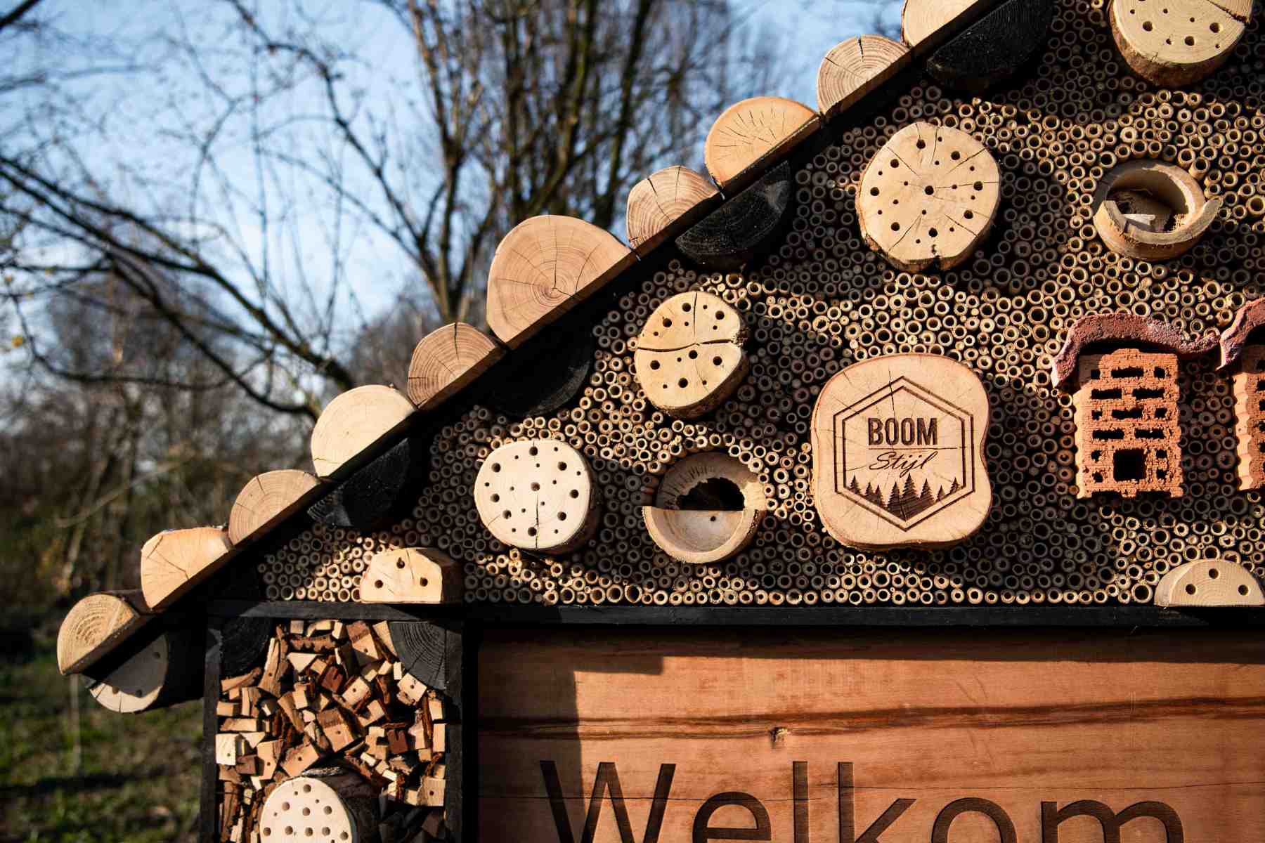 Wij maakten dit reuze insectenhotel van maarliefst 3 x 2.40 meter. Het insectenhotel staat op een mooie plek in De Bijenvallei. Een omgeving die speciaal is ingericht met bloemen en planten die de biodiversiteit bevorderen. Wanneer je het pad langs de speeltuin richting de bosrendieren volgt, kom je er vanzelf langs. Met de komst van het insectenhotel is De Bijenvallei compleet. Het hotel is gemaakt van gebruikt hout. Tijdens het snoeien en kappen van bomen, komt veel hout terug naar ons terrein. Met dit hout willen we zo duurzaam mogelijk omgaan. Daarom maken we van de beste stammen diverse unieke houtproducten onder de naam BOOM Stijl. Ook is er gebruik gemaakt van restmaterialen, zoals bamboe. En het meest bijzondere resthout is afkomstig van de klimstructuur van Gorilla eiland uit de dierentuin.