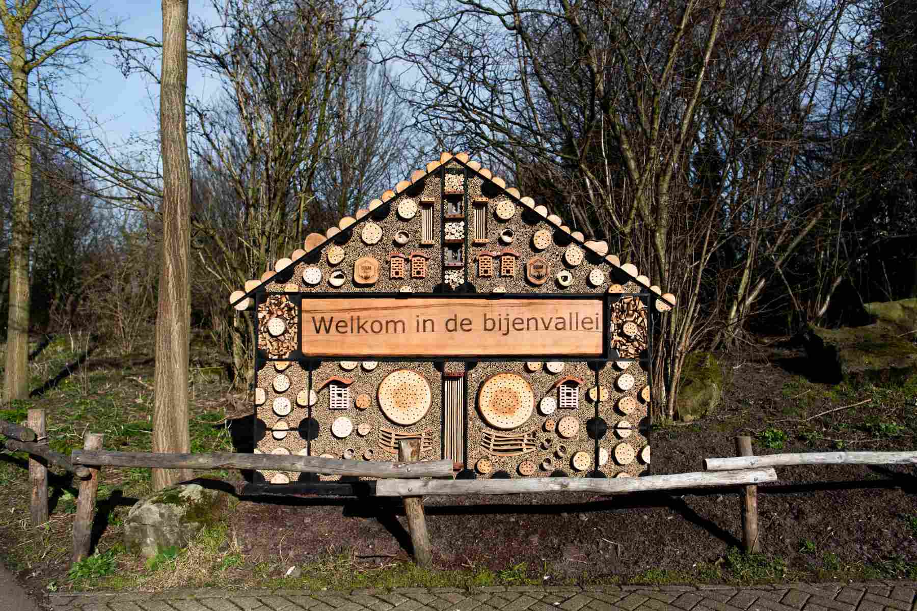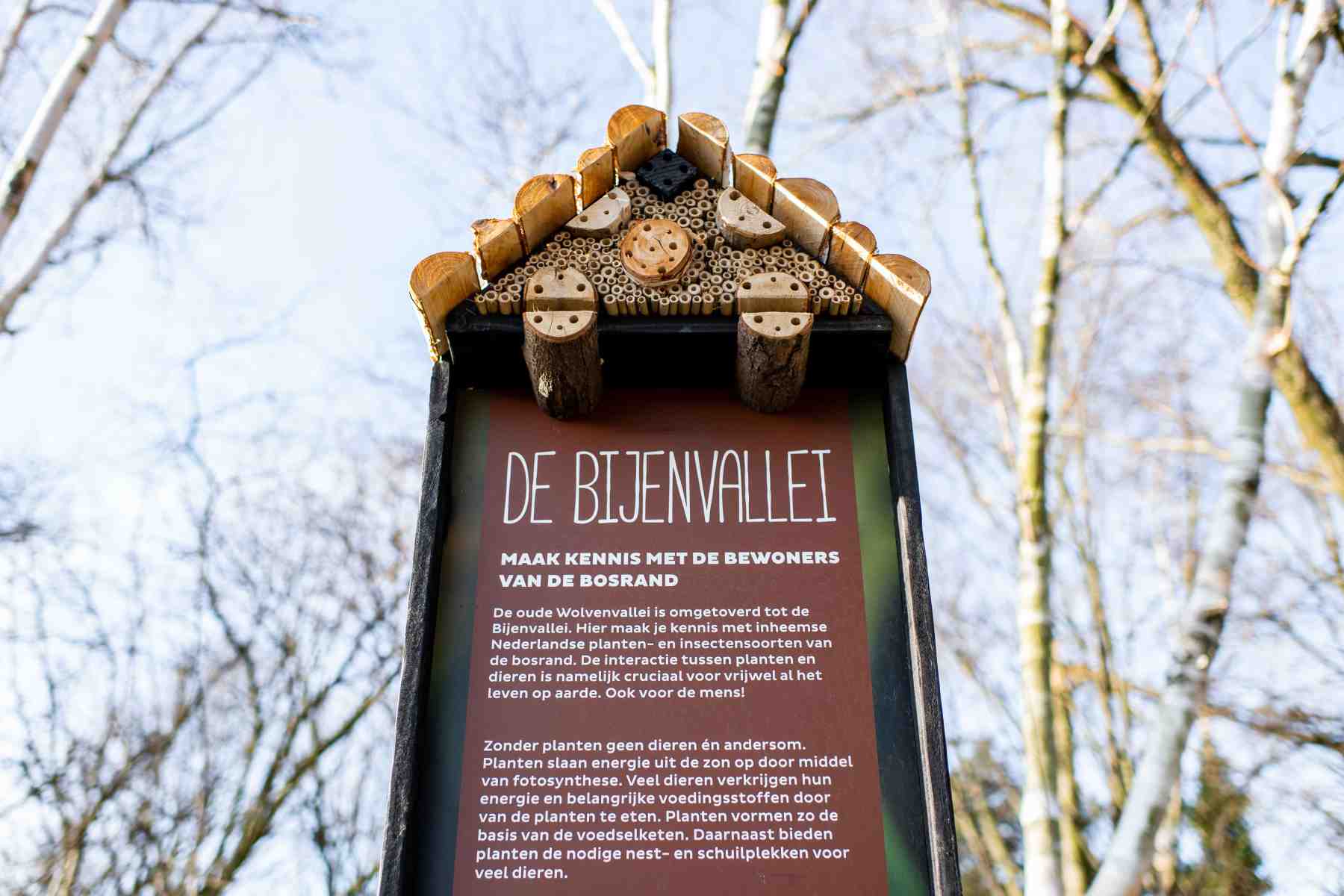 Ook de informatieborden in De Bijenvallei zijn voorzien van een insectenhotel. Zo lees je meer over biodiversiteit en over de soorten bloemen en planten die in de vallei te vinden zijn. Een leuk weetje is dat voorheen in deze Bijenvallei de wolven hun plekje hadden. Al deze leuke wetenswaardigheden zijn nu omringd door vliegende insecten die daar in hun holletjes kruipen.